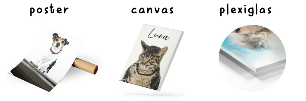 This collection offers a wide palette of possibilities to immortalize your love for your pet. Choose from watercolor, realistic, cartoon, drawn styles, impasto, and floral portraits for a personal artwork that speaks to the heart.